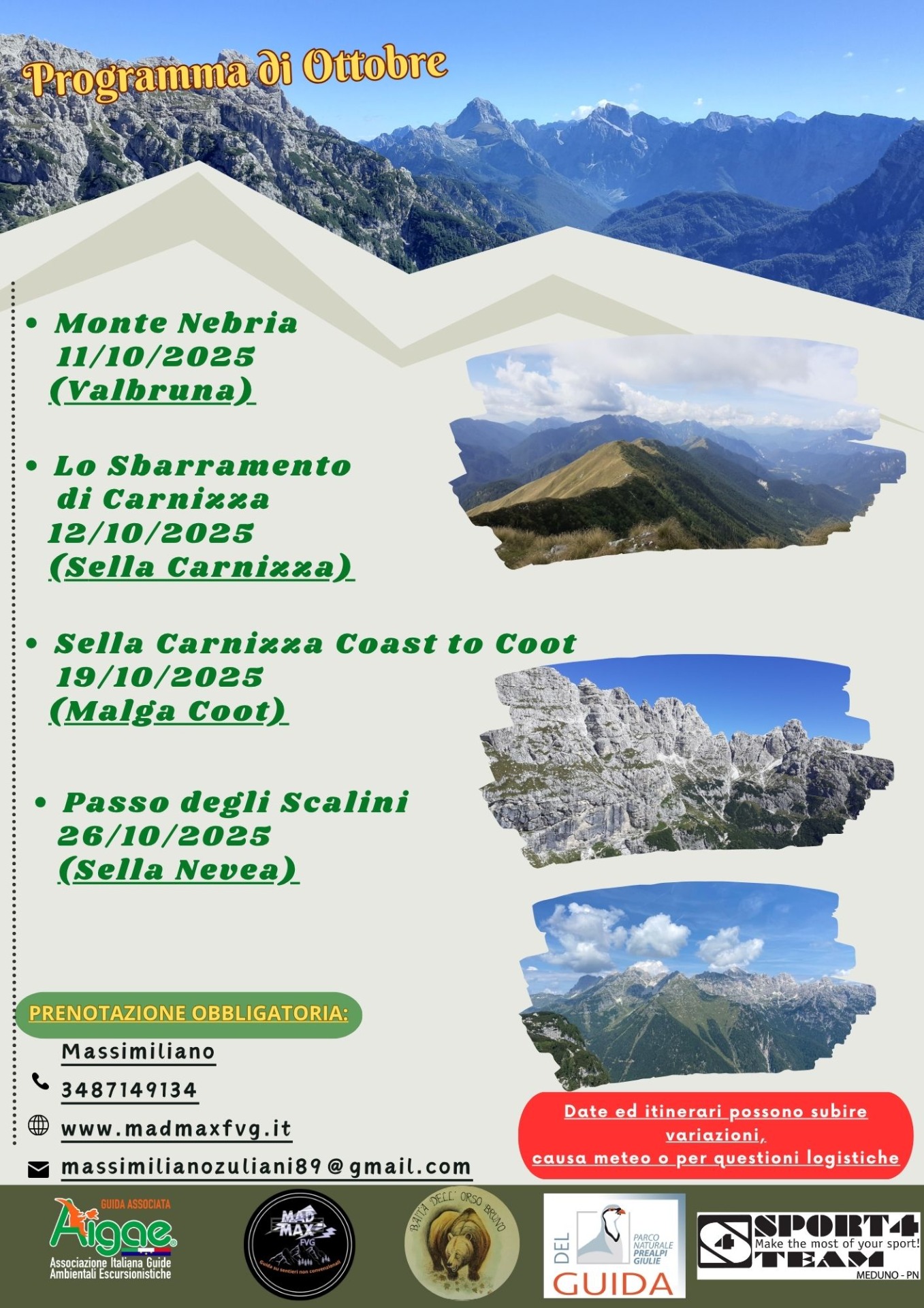 Chiuderemo il mese tornando sulle Giulie, che per l'occasione si mostreranno dipinte dei bellissimi colori dell'autunno. Da Sella Nevea raggiungeremo prima Malga Cregnedul, per salire poi al Passo degli Scalini. Punto di Osservazione privilegiato fra Italia e Slovenia, che offre dei bellissimi panorami.