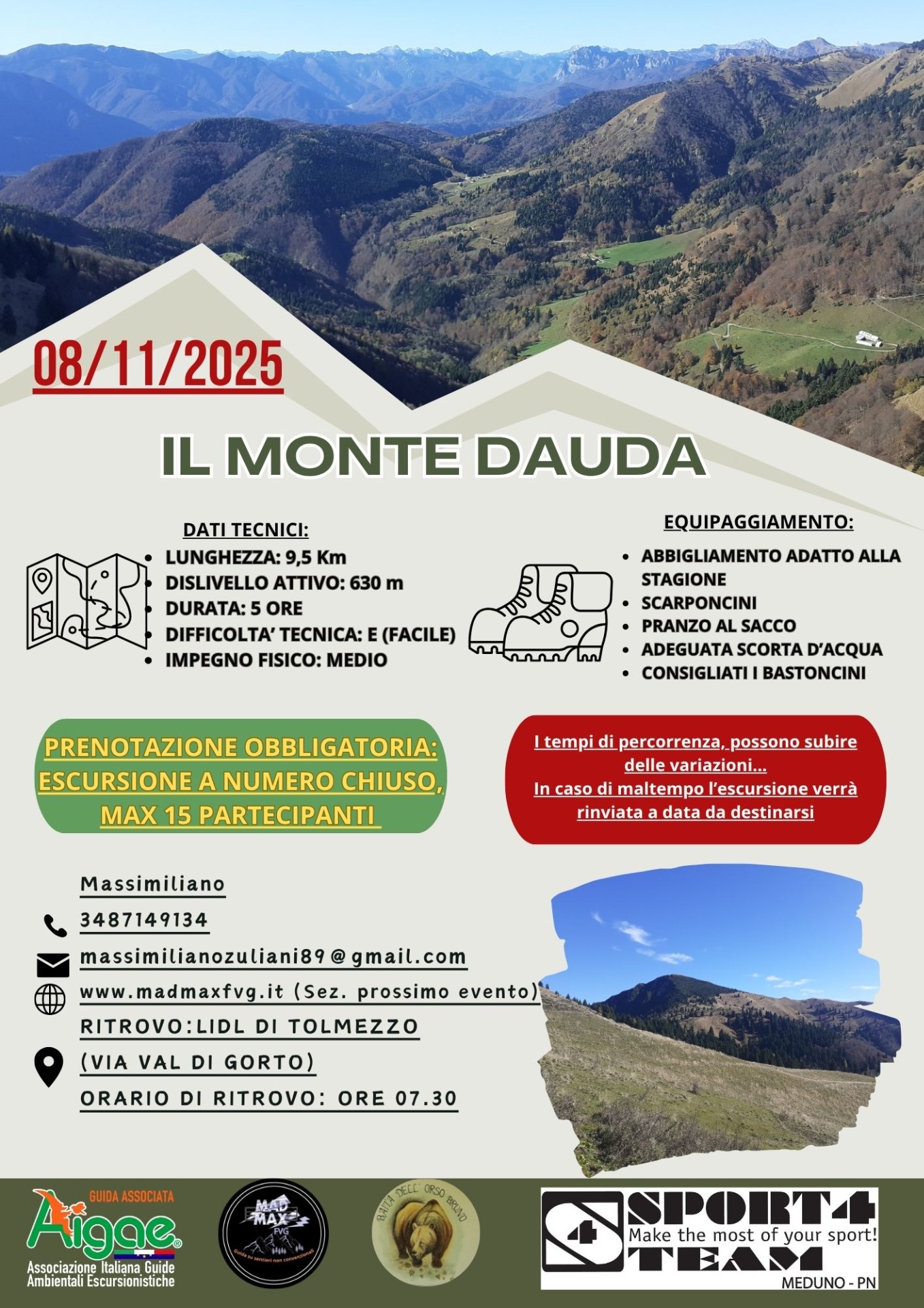 Sabato recuperiamo l'uscita saltata la settimana scorsa per un meteo infausto e torniamo sulle Prealpi Carniche, con l'auspicio che la neve ci risparmi i grattacapi ancora per un po'. La meta sarà il Monte Dauda e per l'occasione non seguiremo l'itinerario classico, ma saliremo da Trischiamps, al limitare della Val di Lauco. La traccia segue un percorso ad anello che ci consentirà di sperimentare la camminata fra vari ambienti naturali diversi, fino a toccare la panoramica cima che si trova nel cuore della Carnia. Dalla vetta scenderemo a Forcella Meleit fino a raggiungere la malga omonima percorrendo una splendida traversata, prima di imboccare la carrareccia che ci riporterà al punto di partenza.