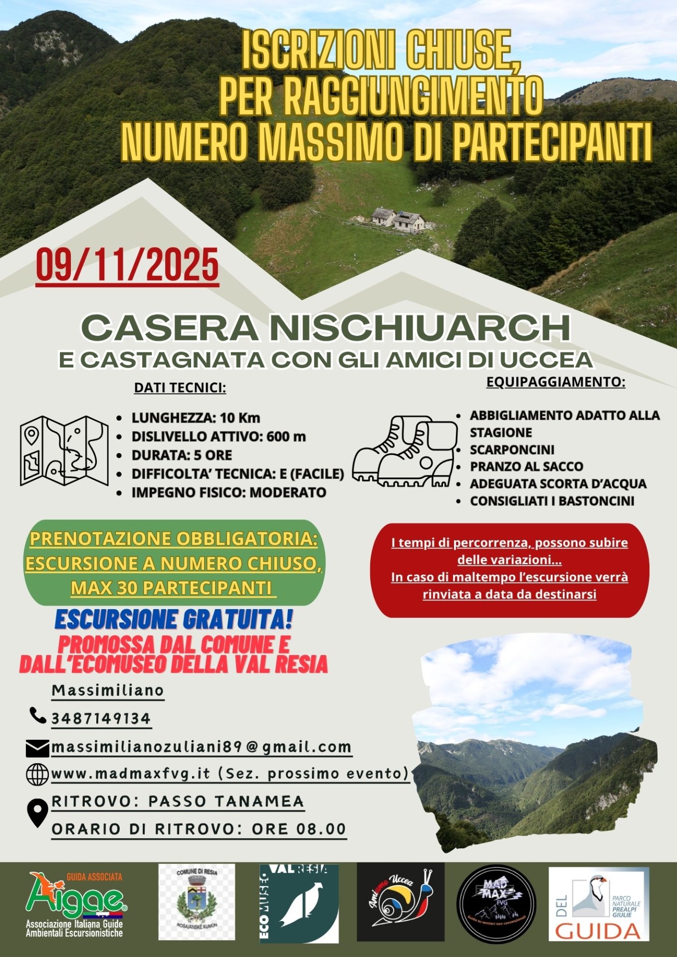 Il Teatro dell'uscita di Domenica sarà invece la Val Uccea, la quale ospiterà l'ultimo appuntamento autunnale, del ciclo escursionistico promosso dal Comune e dall'Ecomuseo Val Resia: ScopriResia 2025. Dopo aver lasciato alcune auto al passo, necessarie al rientro , ci porteremo ad Uccea. Dal paesino di confine risaliremo attraverso dei bellissimi boschi di faggio, lungo antichi sentieri, i pendii che conducono in prossimità del passo di Sella Carnizza. Il nostro punto di arrivo intermedio sarà Casera Nischiuarch, dove avremo modo di sostare e passare un po' di tempo in compagnia, gustando le caldarroste. Poi scenderemo alla volta di Passo Tanamea, e qui si concluderà la nostra escursione. Procederemo quindi al recupero organizzato dei mezzi lasciati ad Uccea in precedenza.