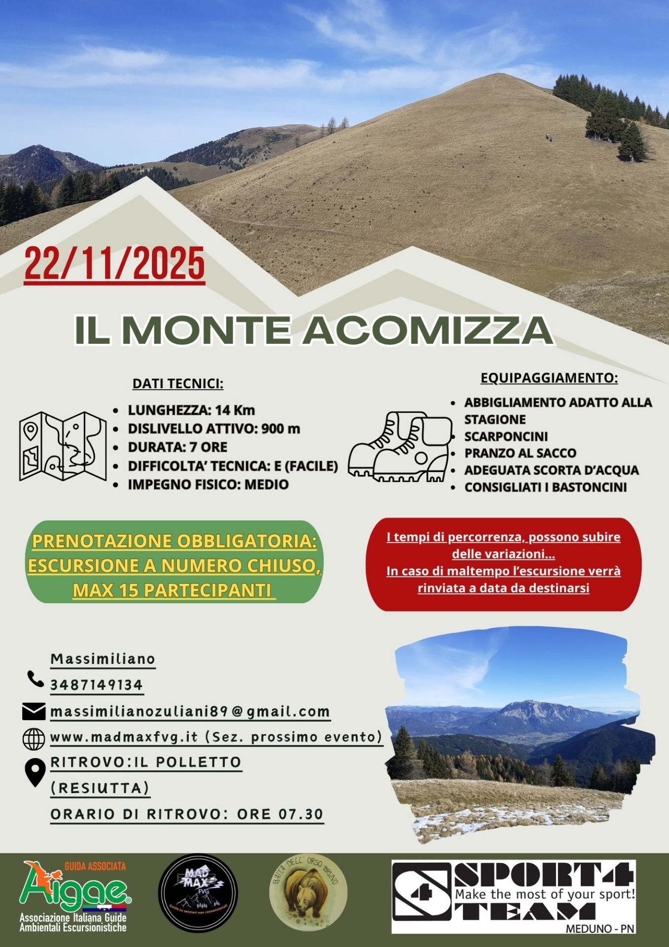 Sabato ci portiamo nella parte orientale della catena delle Alpi Carniche. Il nostro itinerario prenderà le mosse da Malborghetto e ci condurrà fino alla sommità del Monte Acomizza, in prossimità del confine austriaco. Il percorso sarà lineare e dopo una prima parte su discreta pendenza vedrà l'alternarsi di tratti in salita a rettilinei pianeggianti. Durante il nostro viaggio avremo modo di prendere confidenza con la foresta millenaria di Tarvisio. Gran parte dell'itinerario si svolgerà infatti al suo interno su carrareccia fino al ricovero forestale nei pressi di Cima Muli. Da qui il sentiero vero e proprio sbuca fra i pascoli ai piedi del Monte Acomizza, ed il passo sarà breve per raggiungere la cima, che offre uno splendido panorama sulle Alpi Giulie e Carniche, ma anche sull'Austria. Il rientro avverrà a ritroso sulla stessa traccia. L'ascesa non presenta alcuna difficoltà tecnica, è richiesto un discreto allenamento alla progressione in salita con dislivello.