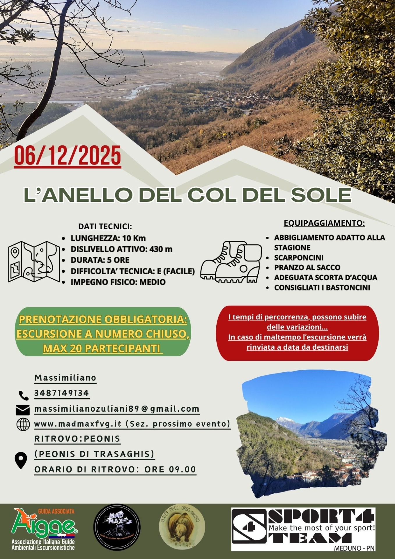Terminato Novembre, apriamo l'ultimo mese dell'anno con un'escursione quasi sulla porta di casa. Prenderemo le mosse dal paese dove cadde Bottecchia per seguire un'antica mulattiera che attraverso boschi, ghiaioni e passi di forcella ci porterà alla radura di Planecis che dorme in posizione illuminata, ai piedi del Col del Sole. Da Qui si gode di un'ottima vista sulla conca glaciale del Lago dei Tre Comuni e su alcune vette delle Prealpi Carniche. Scenderemo poi verso la frazione di Avasinis, dapprima attraversando zone di risorgiva, per poi percorrere un bellissimo sentiero lastricato di antica fattura. Una volta ai piedi dei rilievi rientreremo lungo l'antica strada Avasinis-Peonis che profuma di tempi passati.