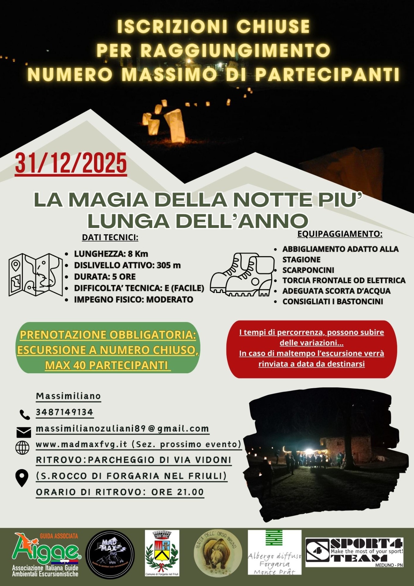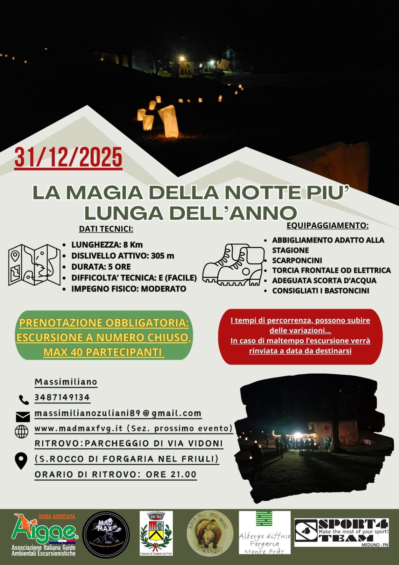 Siamo stati in movimento per tutto il 2025 ed abbiamo deciso di non stare tranquilli nemmeno l'ultima notte dell'anno. Sì, perchè se non avete programmi o cercate un'esperienza diversa dal solito cenone, questa potrebbe essere la Vostra occasione! Concludiamo la stagione ai piedi delle Prealpi Carniche, nel comprensorio dell'Altipiano di Monte Prat. Partiremo dalla frazione di S. Rocco in Forgaria nel Friuli, per salire in direzione dell'altipiano alla luce delle torce elettriche, nell'oscurità della notte più lunga dell'anno, attraverso caratteristici sentieri. Una volta arrivati in quota, ci porteremo su una splendida terrazza panoramica naturale, per un brindisi e godere dei fuochi artificiali che illumineranno la piana friulana. Una volta brindato e scambiatici gli auguri, scenderemo al punto di partenza per concludere l'esperienza.