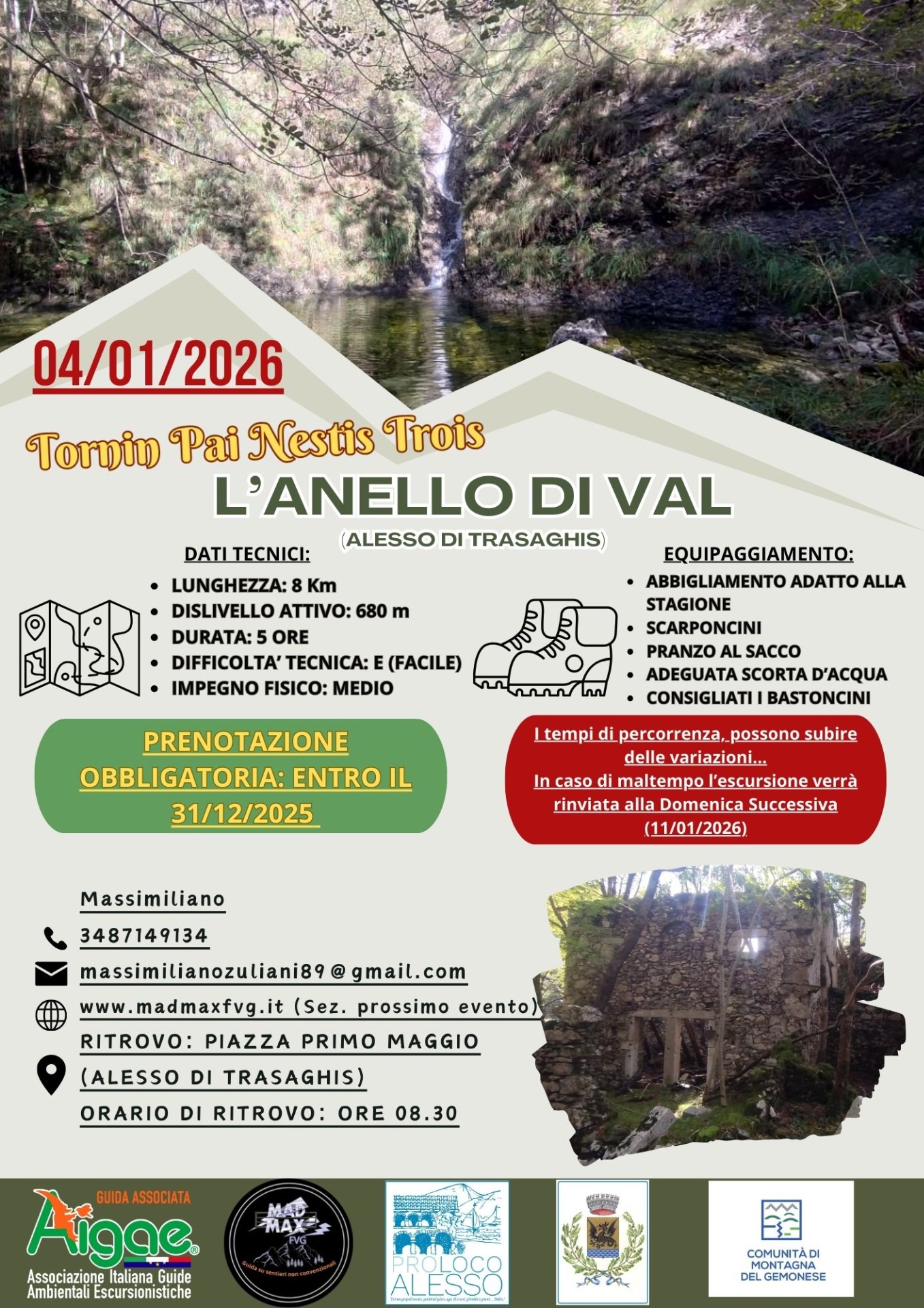 Comincia un nuovo anno e con esso prende il via la stagione escursionistica 2026. Per un po' la neve caduta ci impedirà di frequentare gli itinerari di quota, ma non per questo ci fermeremo. Stavolta siamo vicino a casa e torniamo ad esplorare la Val del Lago. Grazie ad una collaborazione con la Proloco di Alesso, diamo seguito al progetto: "Tornin pai nestis trois", una serie di avventure escursionistiche che puntano a far conoscere gli antichi sentieri che collegavano varie località della valle. Stavolta partiremo dal paese, per raggiungere località Val. I sentieri che percorreremo attraversano un territorio affascinante e selvaggio e raggiungono quelli che una volta erano gli stavoli dedicati all'alpeggio ed alla fienagione. Si tratta dunque di un itinerario ad anello che non presenta difficoltà tecniche, ma che richiede una discreta preparazione fisica. L'evento è patrocinato e promosso dalla Proloco di Alesso.