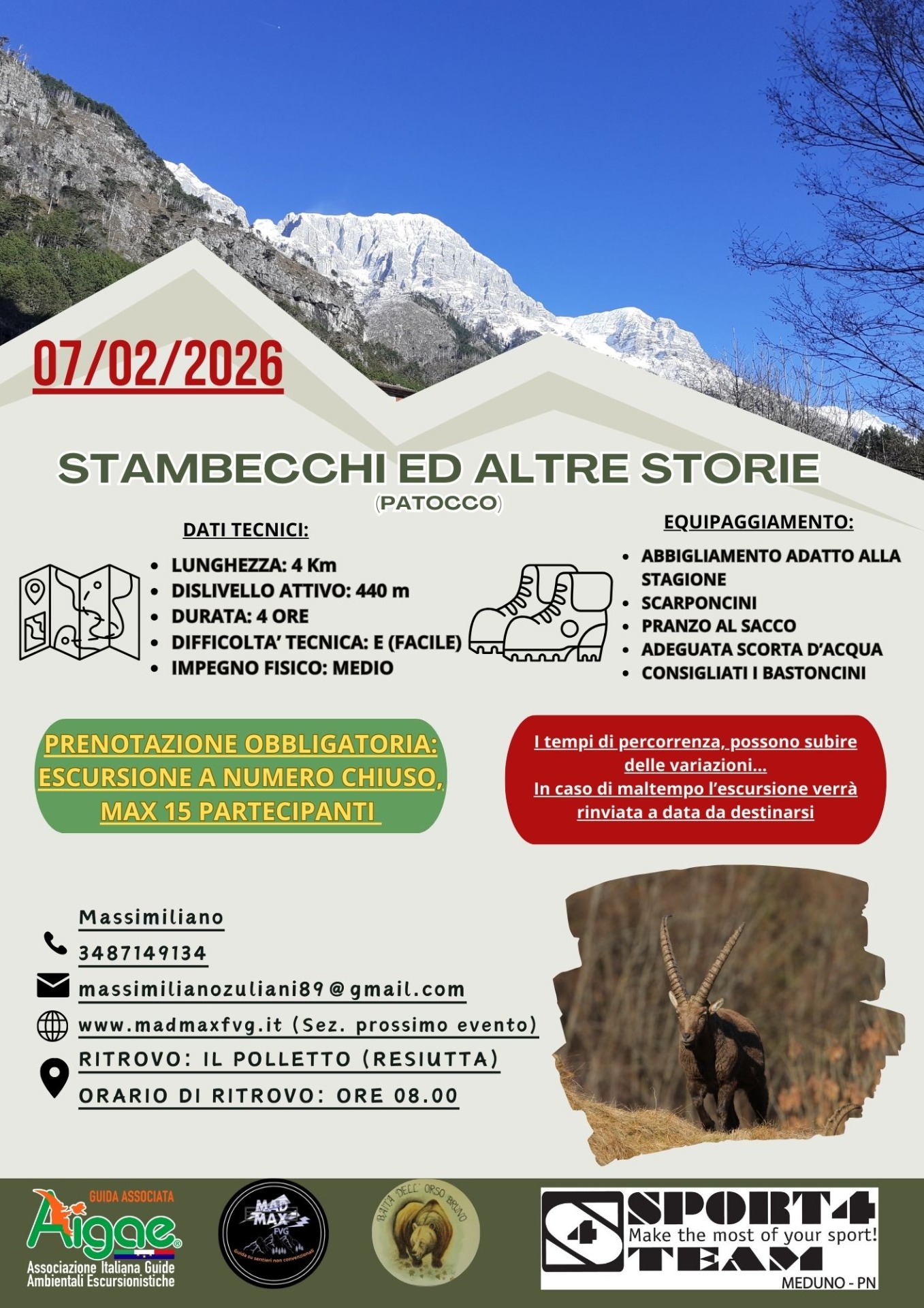 - Sabato cambiamo un po' le modalità di esecuzione dell'escursione. Torniamo infatti nella riserva di Biosfera delle Alpi Giulie per una breve ma caratteristica uscita il cui obiettivo non sarà raggiungere la vetta, ma l'osservazione faunistica. Per l'occasione saliremo a Patocco, frazione di Chiusaforte dove una volta raggiunto il borgo, ci sposteremo a piedi alla ricerca degli stambecchi, il cui periodo di accoppiamento è appena terminato. Sarà necessario porsi nei confronti degli animali con grande rispetto, al fine di poterli osservare, fotografare ed imparare a conoscere, senza arrecare disturbo. Terminata l'esperienza di appostamento, potremo liberare le gambe per una breve scarpinata ai piedi delle Alpi Giulie.