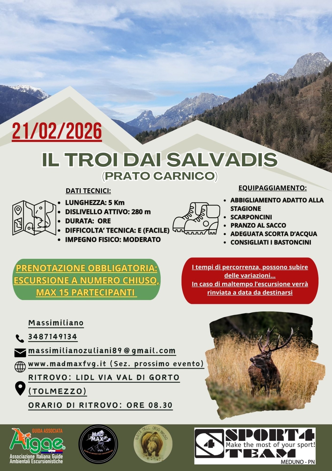 Come preannunciato alcune uscite del mese corrente verranno dedicate alla fauna. Ci portiamo quindi nella splendida valle del tempo, per frequentare un sentiero tematico dedicato ai selvatici. Si tratta di un itinerario circolare che percorre sentieri e carrareccia. La traccia ci porterà attraverso dei bellissimi boschi, dove incontreremo delle rappresentazioni degli animali che andremo a conoscere, analizzandone: abitudini, comportamento e segni di passaggio. Non mancheranno gli scorci panoramici, nella fattispecie sull'innevata linea di Sauris che si staglia all'orizzonte, e l'inconfondibile sagoma delle Dolomiti Pesarine, poste a guardia dell'omonima valle. Si tratta di un'occasione per trascorrere del tempo assieme, immersi nella natura, al fine di conoscere gli abitanti dell'ambiente montano, senza fare un'eccessiva fatica.