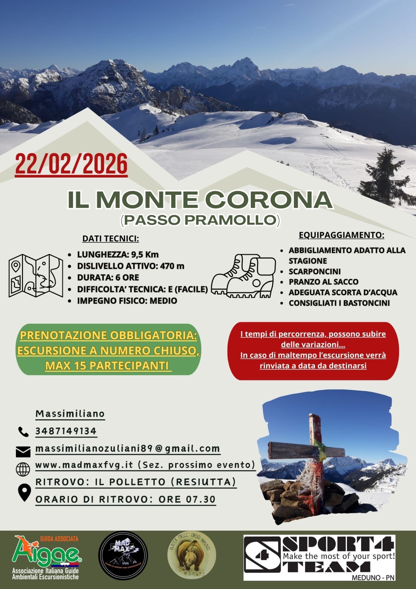Domenica torniamo dunque in quota per un'escursione invernale che corre sul confine con la Carinzia. Saliremo per l'occasione con i mezzi fino al Passo di Pramollo. Da qui comincerà la nostra escursione, che seguendo un itinerario lineare in quota, senza costringerci ad affrontare un dislivello eccessivo, ci porterà in vetta al Monte Corona. Si tratta di una cima estremamente panoramica nel cuore delle Alpi Carniche. L'uscita si svolgerà in ambiente innevato, prevalentemente su pista forestale, fino al tratto che conduce alla cima, il quale si sviluppa su sentiero. Dalla vetta si potrà godere di una splendida vista a 360° in contesto alpino, vestito di bianco per l'occasione. Dopo la meritata sosta rientreremo lungo la medesima traccia.