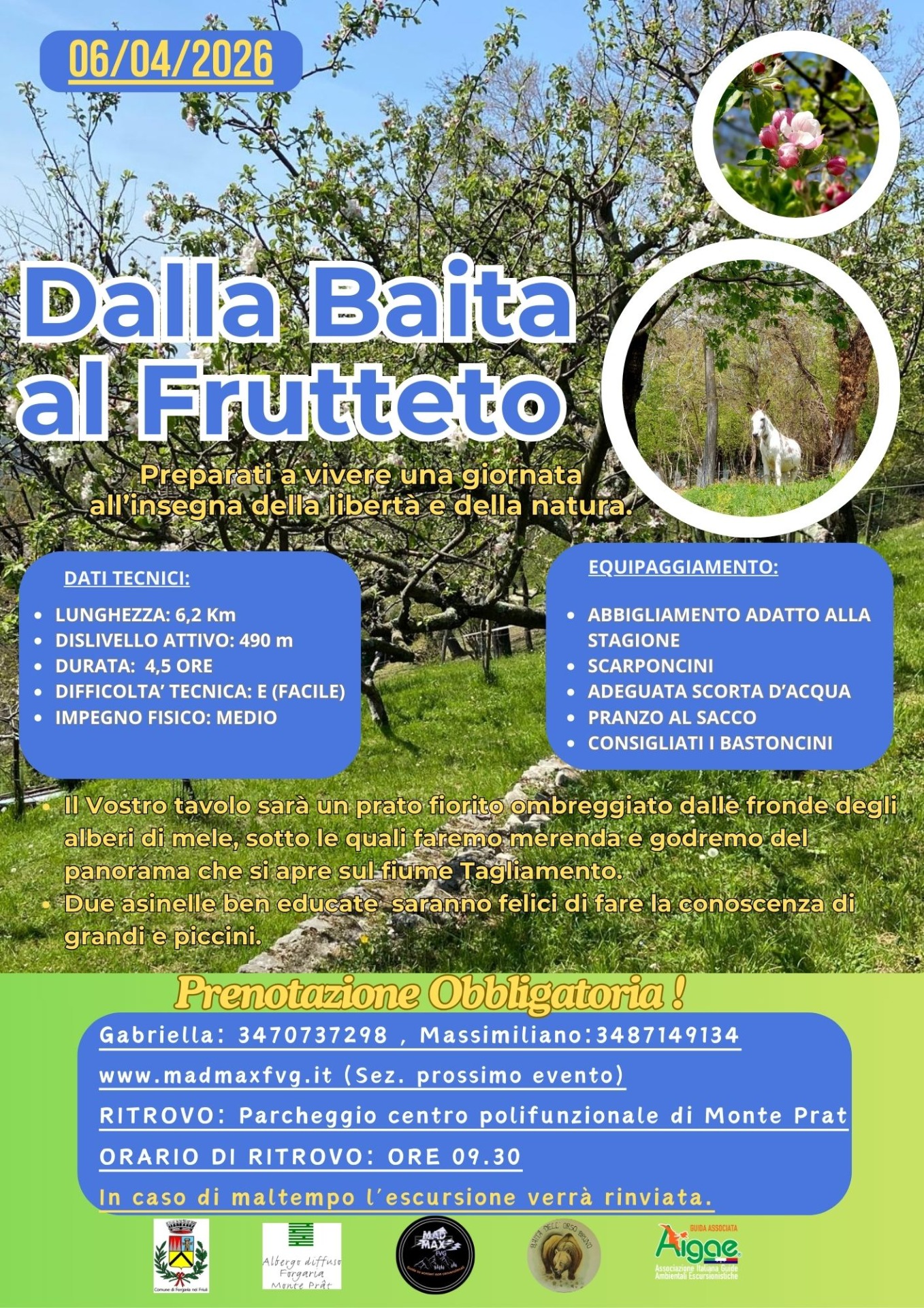 Non avete idee per Pasquetta? Perchè non alzarsi dal divano ed affrontare la giornata in maniera dinamica? Vi proponiamo allora una nuova esperienza: un'escursione che dall'altipiano di Monte Prat scende verso la zona pedemontana di Forgaria nel Friuli. L'occasione sarà buona per familiarizzare con le prime fioriture, attraversare le faggete che cominciano ad inverdire e perchè no fare qualche incontro faunistico. La particolarità è rappresentata dal fatto che l'uscita avverrà in discesa, per giungere ad un bellissimo frutteto in fiore, dove potremo stendere le coperte e fare un simpatico pic nic. Durante la sosta ci faranno compagnia le asinelle Brina e Cloe, sempre disposte a fare nuove amicizie. Seguirà rientro.