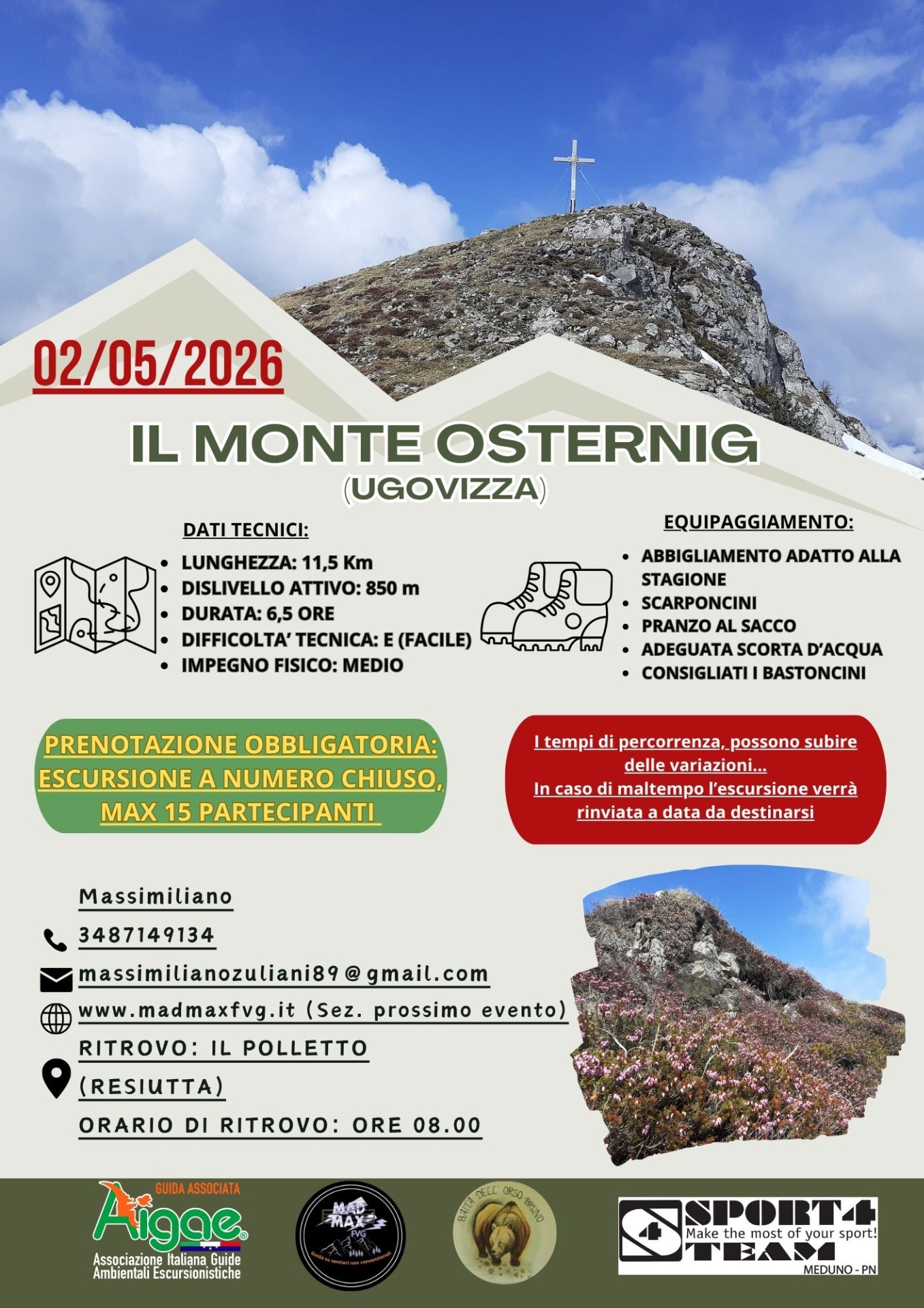 Dalle Giulie torniamo sulla catena Paleocarnica. Stavolta partiremo da Ugovizza, o meglio dal parcheggio che si trova a circa 30 minuti dal Rifugio Fratelli Nordio. La prima mezz'ora di percorrenza, si svolgerà su carrareccia e quindi costituirà un buon riscaldamento, che ci permetterà di metterci in moto. Giunti al rifugio si imbocca il sentiero che sale fra l'acre odore delle peccete, la cui ombra ci permetterà di non patire eccessivamente la calura. Poi d'improvviso si sbuca fra i pascoli e si raggiunge il villaggio alpino di Sella Bistrizza, dirimpettaio della cima che raggiungeremo. Il monte Osternig si trova proprio sopra il villaggio e lo si raggiunge utilizzando un sentiero misto a mulattiera, che permette di distribuire l'impegno fisico in maniera adeguata, prima di raggiungere la vetta. Una volta in cima si respira aria di frontiera e si può godere di uno splendido panorama su entrambe le nazioni e le loro splendide montagne. Si rientra quindi con calma lungo il medesimo itinerario.
