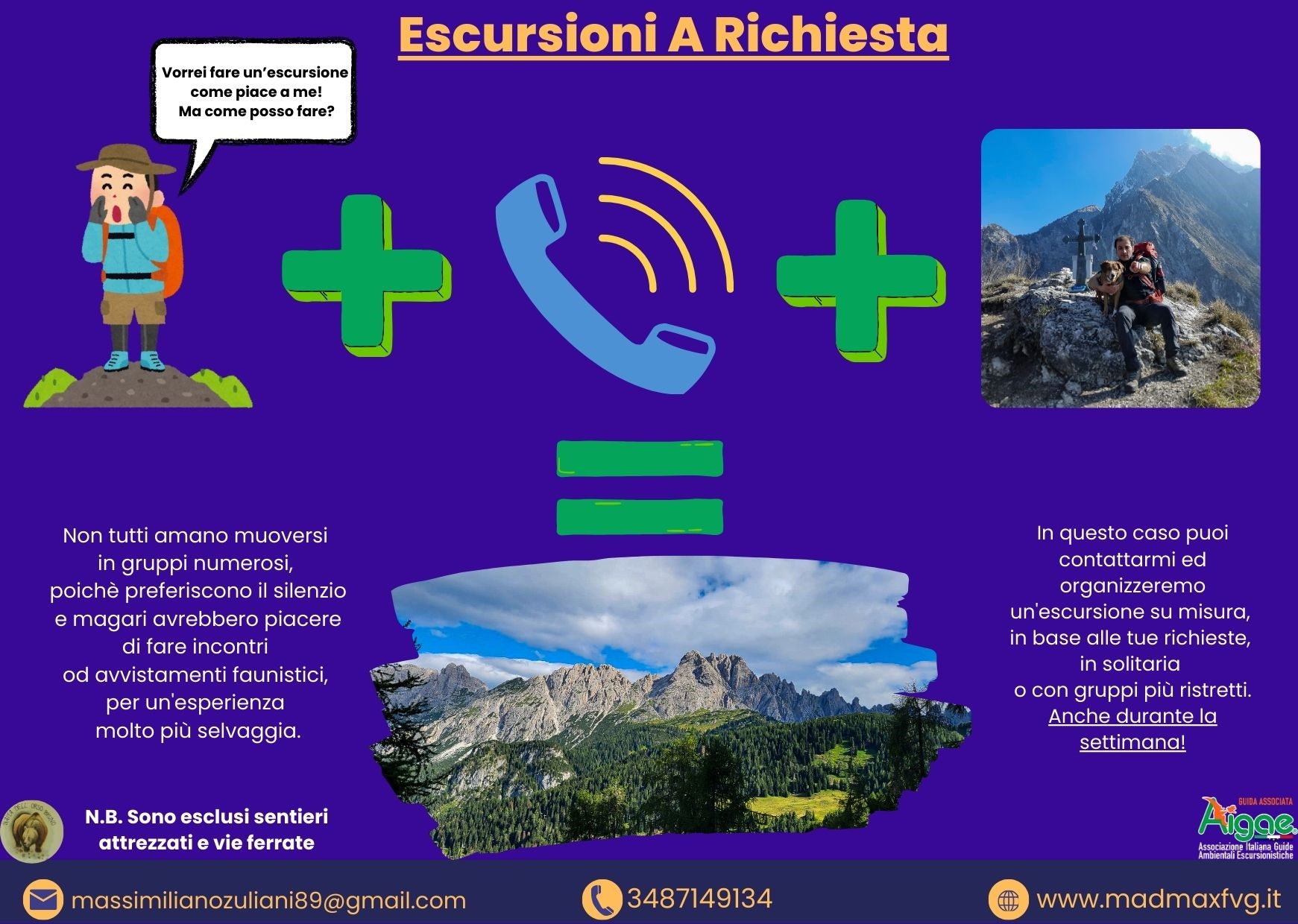 Se ami la montagna e vorresti frequentare dei nuovi itinerari, potresti farti accompagnare da una guida. Non tutti amano però muoversi in gruppi numerosi, poichè preferiscono il silenzio e magari avrebbero piacere di fare incontri od avvistamenti faunistici, per un'esperienza molto più selvaggia. In questo caso puoi contattarmi ed organizzermo un'escursione su misura, in base alle tue richieste, in solitaria o con gruppi più ristretti. Anche durante la settimana! Di modo da poter vivere appieno l'ambiente montano.